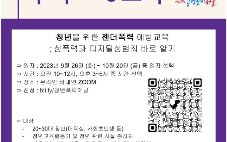 [모집] 청년을 위한 젠더폭력 예방교육_9월 26일부터 10월 26일 중 선택 가능