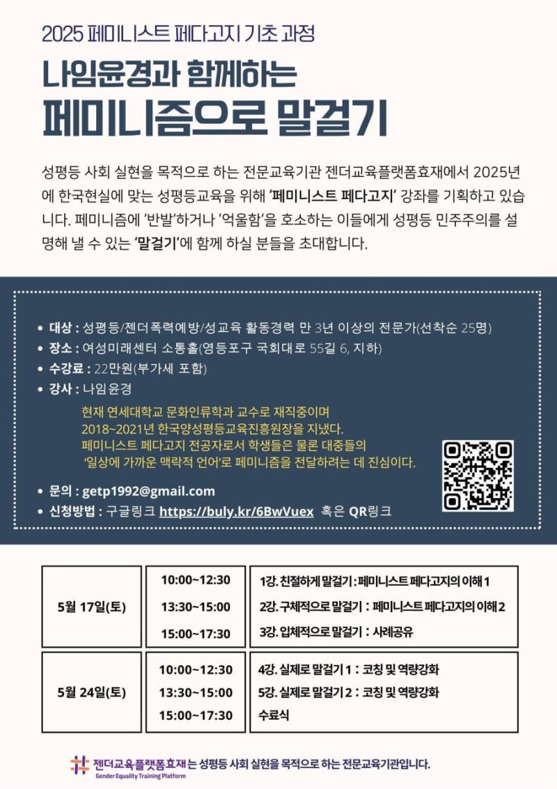# 참가 : 선착순 25명, 성평등/젠더폭력예방/성교육 활동경력 만 3년 이상인 전문가