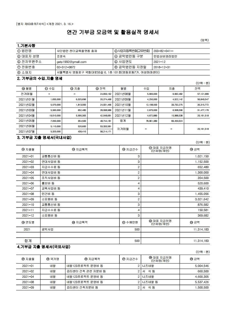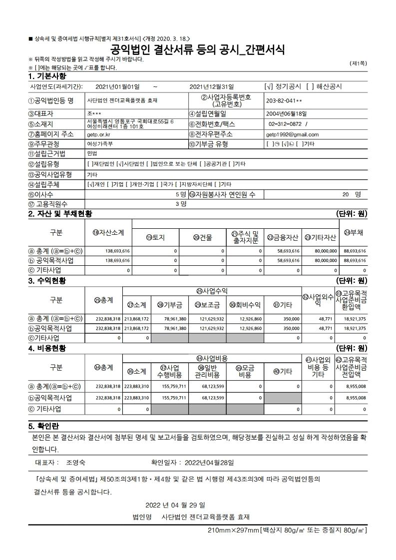 공지사항 2021년 공익법인 결산서류와 연간 기부금 모금액 및 활용실적 명세서 By admin, 29 4월, 2022 젠더교육플랫폼효재는 공익활동을 수행하는 기부금단체로써 기부금 모금액 및 활용실적 공개 등의 의무이행여부를 매년 자체점검하고 국세청에 '공익법인 등 의무이행 여부 점검결과 보고서'를 제출하고 있습니다. You may also like 공지사항 ‘소년과 남성의 날’ 기념『Boys Don’t Cry』 소개 카드뉴스 배포 공지사항 2024년도 공익법인 결산서류 및 기부금 모금 및 활용실적 보고서 공시 공지사항 [모집] 2025 페미니스트 페다고지 기초과정 _ 나임윤경과 함께 하는 '페미니즘'으로 말걸기(5/17, 5/24)