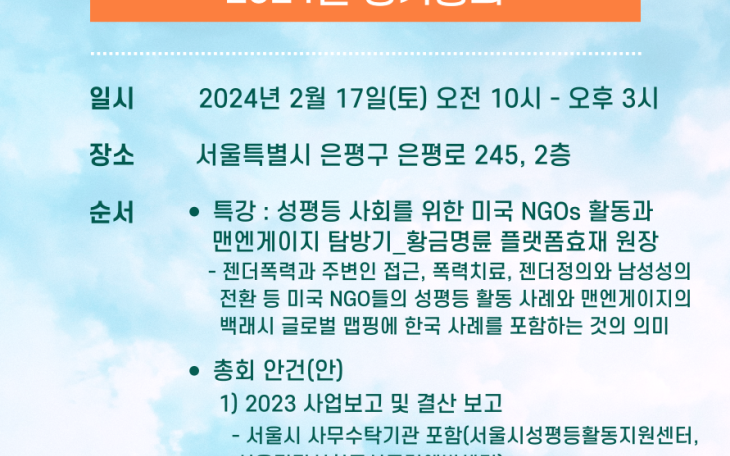 공지사항 [알림] 젠더교육플랫폼효재, 2024년 정기 총회 2024년 2월 17일(토) 오전10시, 흥미 돋는 발제와 따스하고 건강한 밥상, 온정 가득 총회가 열립니다. 회원 여러분, 총회에서 만나요! Read more