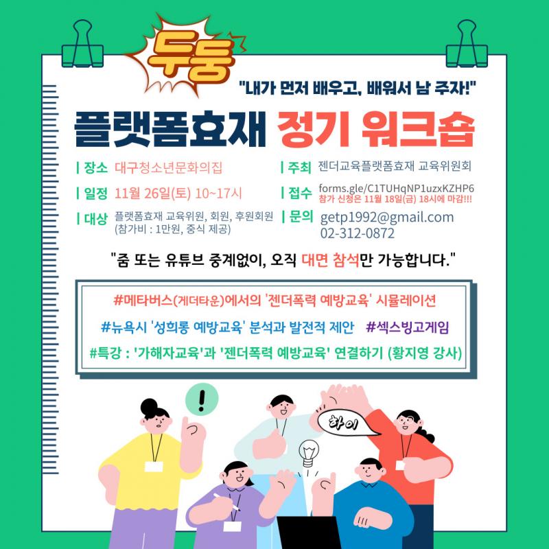 [젠더교육플랫폼효재의 교육위원회]의 정기 워크숍이 11월 26일, 대구에서 개최됩니다.