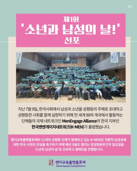 젠더교육플랫폼효재는 이번 활동을 통해 소년과 남성의 날이 성평등한 사회를 만들기 위한 새로운 남성성 전환의 출발점이 되기를 기대합니다. 나아가 감정을 솔직하게 표현하고 타인과 공감하는 남성성의 가치를 확산시켜, 학교와 직장, 가정에서 폭력과 차별이 줄어드는 변화를 만들어 가고자 합니다.