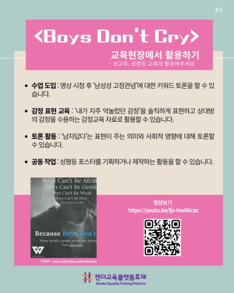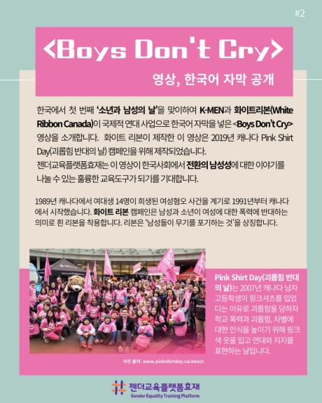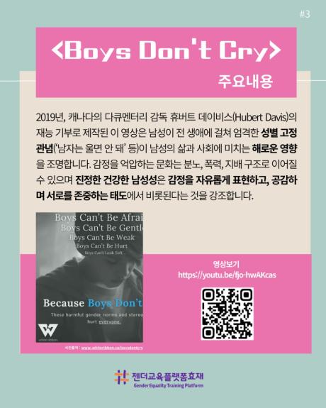 젠더교육플랫폼효재는 ‘소년과 남성의 날’을 기념, 『Boys Don’t Cry』 영상 소개 카드뉴스를 제작·배포합니다.