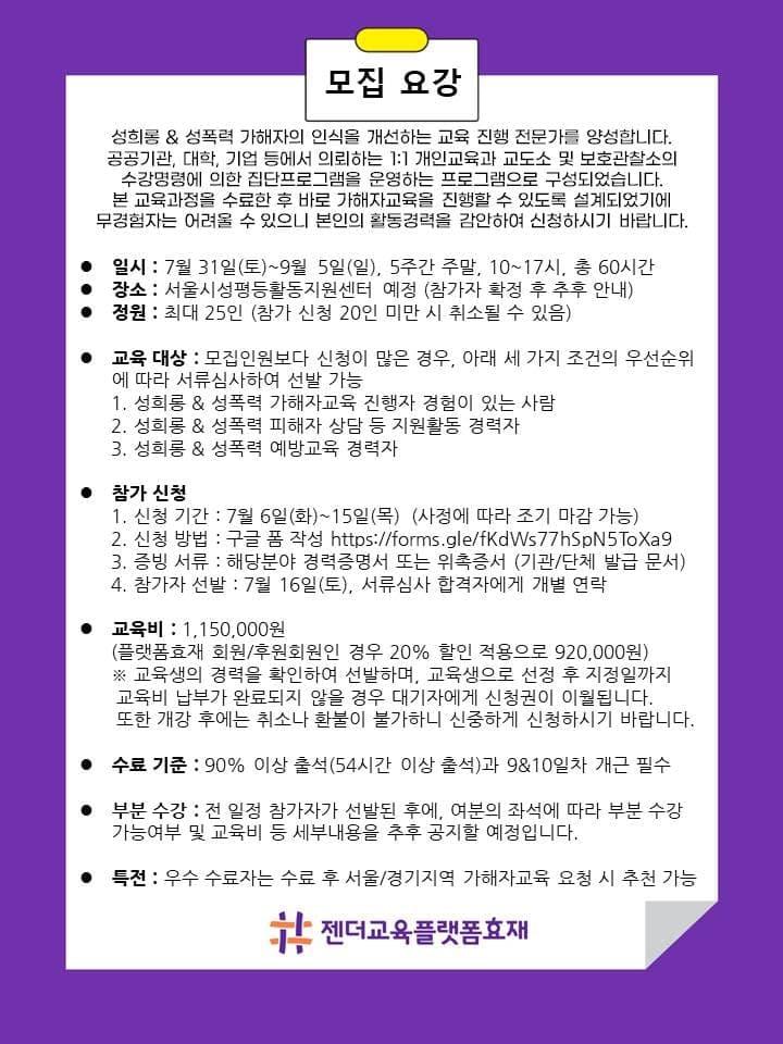 플랫폼효재에서 성희롱 & 성폭력 가해자의 인식을 개선하는 교육 진행 전문가를 양성합니다.