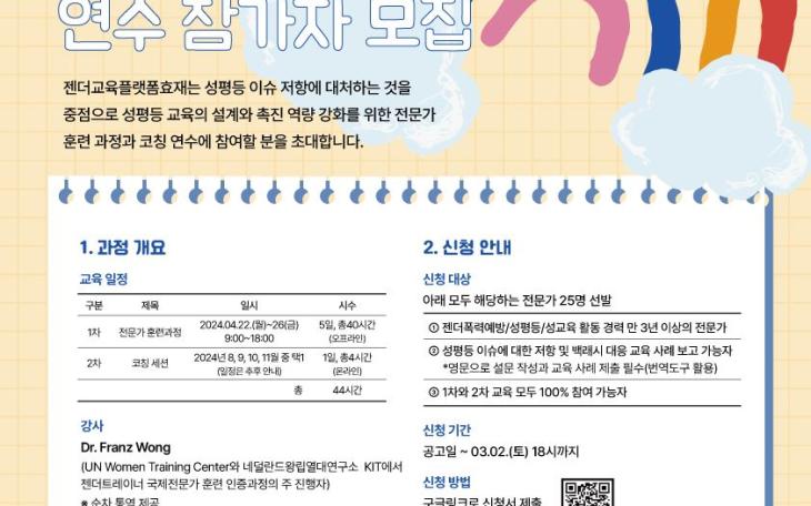 공지사항 [알림] 젠더교육플랫폼효재, 2024년 정기 총회 2024년 2월 17일(토) 오전10시, 흥미 돋는 발제와 따스하고 건강한 밥상, 온정 가득 총회가 열립니다. 회원 여러분, 총회에서 만나요! Read more